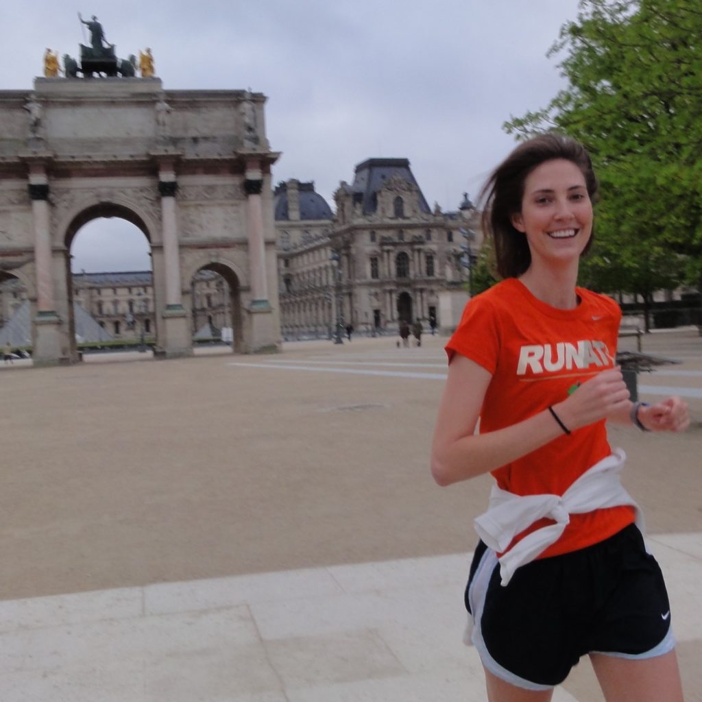 Arc du Carousel – Kristy 8:01 AM – Kristy, from Atlanta (USA), one week after running the half-marathon of Georgia, and having fully recover from the race, chose to do a sporting visit of Paris with Paris Running Tour. We explored “l’Ile de la Cité”, the right bank going through “le Louvre”, “les Tuileries” and the “Champs Elysées”, then we rejoined the left bank to run under the arches of the Eiffel tower, we crossed “les Invalides” and went along the river Seine to finish in the Quartier Latin. During the visit, as the armies of Napoléon, we “triumphantly” went through the “Arc du Carousel”! Merci Kristy*! The “Arc du Carousel”: After his victory in Austerlitz, Napoléon declared to his troops : “I will bring you back to France. You will pass through arches of triumph on your way to your homes!”. Therefore were constructed the “Arc du Carousel” at the Tuileries and the majestic Arc de Triomphe at place de l’Etoile. 130 years before, Louis XIV ordered the construction of the Arcs of “la Porte Saint-Martin” and of “la Porte Saint-Denis” in the North of Paris. Un jour de revue sous l’Empire. Hippolyte Bellangé 1862. Musée du Louvre. © Photo RMN – F. Raux On this picture, in the background, behind the Arc du Carousel, we can see the “Palais des Tuileries”, which closed the Louvre by the west side. The palace was burnt during the events of “La Commune” in 1871. * See Kristy’s blog about running and healthy food, a good choice for life! The route of the tour: