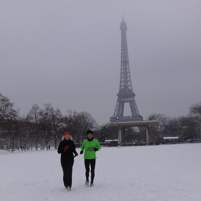 Champ de Mars -Far off, the “kiosque à musique” (banstand)   Champs de Mars – Far off, the “École Militaire” (Military School)   Champs de Mars – Alley Thomy-Thierry   Champ de Mars – Far off, behind the Eiffel Tower, the “Palais de Chaillot” (Trocadéro)   Running on the snow near the Eiffel Tower… 🙂 In October! In January! No matter what month we are, it is always a pleasure to run in Paris! Come and do a tour, a nice visit while running with Paris Running Tour!
