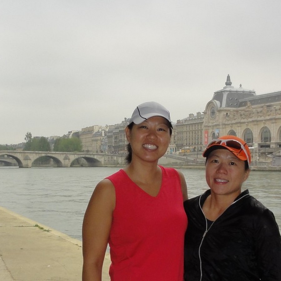 Susan and Michelle – The river Seine near the Tuileries garden, in front of the Orsay Museum 9:03 AM – Susan and Michelle are two New-York road-runners (NY – USA). Michelle prepares at present the Marathon of Chicago. After a first visit of Paris last year, their choice was for a little bit different route. We started near the Seine on the left bank. Look on the photo above, the new “emmarchement” in front of the Orsay Museum, “emmarchement” which is a part of the new banks of the Seine (very much enjoyed by runners). Having crossed the pedestrian footbridge Léopold-Sédar-Senghor, run in the Garden of the Tuileries and admired the place Vendôme, we were able to cross our first covered passage, the long passage Choiseul: Michelle, Susan – Passage Choiseul Not far from there, it is with pleasure that we met the beautiful “salle Favart”, National Theater of the “Opéra Comique” : Michelle and Susan – Opéra Comique It is the third “Salle Favart” built in 1898, both previous ones having burned. Second covered passage on our route, the Passage of the Panoramas, the oldest passage of Paris (we had already spoken about it here) : Susan, Michelle – “Passage des Panoramas” Just in front of the “Passage des Panoramas” is the Passage Jouffroy where a curious medieval character welcomes you: Susan and Michelle with a character of the Grévin Museum It is about one of the numerous wax characters of the Grévin Museum, the Parisian counterpart of Madam Tussauds of London. The entrance of the museum is situated in the Grand boulevards and the exit in the Passage Jouffroy. A little later, we found an old acquaintance, the Statue of Liberty (well, a Parisian younger sister…): Susan, Michelle – The Statue of Liberty in the museum of “Arts et Métiers” To know more about the Parisian statues of Liberty, click here. We continued our road and again crossed magnificent passages: “Passage du Grand Cerf” “Galerie Vero-Dodat” “Galerie Vivienne” These Parisian passages were approximately 150 in the middle of the 19th century, there are less than thirty nowadays. Our running allowed us to cross nine of them, among the most beautiful: We ended the tour by crossing the beautiful garden of the “Palais Royal”, isolated from the Parisian street by its long galleries of arcades, Michelle, Susan – Garden of the “Palais Royal” participated in the work of art constituted by the Columns of Buren (“Les deux plateaux” of the Artist Daniel Buren), On the columns of Buren in the “Palais Royal” and made a small break in front of the Louvre before crossing again the Seine to join the Left bank. Susan and Michelle – The Louvre museum Look on the Louvre Pyramid the sign of the Third Paradise, bound to The temporary exhibition of Michelangelo Pistoletto. Merci Susan, merci Michelle ! The route of the tour :