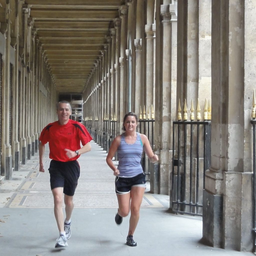 Pyramide du Louvre – Nigel, Karen and Jean-Charles 8:06 AM – With Karen and Nigel from UK, we started from the Opera District to go along the river. Karen and Nigel finished with success the Brighton half-marathon one week ago. We ran at a good pace though, with no consideration for the little rain we had in Paris this morning. The route we took allowed us to notice that many Parisian places share classicism and modernity with harmony. For instance, in the Louvre district, we appreciated how the pyramid of the Louvre was designed to respect the environment of the surrounding classic buildings. Not so far, in the Palais Royal, we saw the Columns of Buren, another example of modern art integrating a classical environment (there was a strong controversy at the time of its creation but, in Paris Running Tour, we like this combination…) Going through a passage in the Louvre to go to the Palais Royal, we had the opportunity to see rooms of the Louvre presenting another mix of modern art and classic art: the temporary exhibition of Tony Cragg, who had juxtaposed his modern sculptures to the classic ones. Merci Karen and Nigel! “Red figure” – Tony Cragg -2008 (on the right 😉 The route of the tour:
