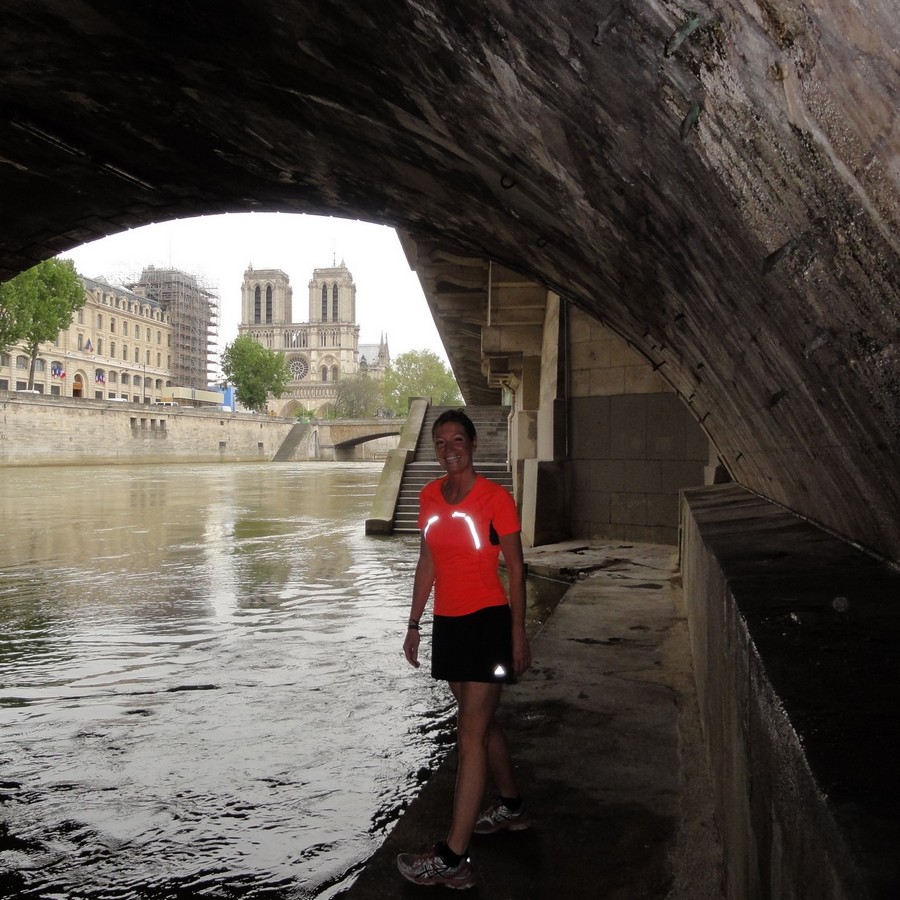 Antje – Under Saint-Michel bridge – In the background, “Notre-Dame de Paris” 7h57 – Antje comes from another great and beautiful European capital, Berlin. She already ran several times the Berlin marathon, one of the fastest world marathons (the last four world records were realized in Berlin).  Antje knows well Paris and that is with pleasure and while running that we rediscovered its most beautiful “paths”. A beautiful route of more than 14 km also passing under bridges of Paris as we can see on the photo above. Our running led us of the Eiffel Tower up to Notre-Dame, then up to the Arc of Triumph. This Friday was making the “bridge” between two holidays, May 8th&9th and the weekend so Paris was very quiet, even the Eiffel Tower seemed deserted (at least at 8 am in the morning). Antje – “Champs de Mars” and Eiffel tower Notice the scaffolds which leave the ground towards the first floor of the Eiffel Tower. These temporary elements are of use to the renovation of the first floor. The objective of this modernization project is to make this floor a more attractive place => Click here. Back from Notre-Dame, this time, it is ON the “Pont Neuf”, the New Bridge, that we ran: Antje – “Pont Neuf” – In the background, the “Pont des Arts” (bridge of the Arts) As its name does not indicate it, the “Pont Neuf”, literally “New Bridge”, is the oldest bridge of Paris. As you can read it on the photo, the bridge was built at the end of the 16th century. Yes, “neuf” means “new” (and not “9”). Is the oldest bridge the new bridge? Indeed, at the time of its construction, this bridge was very modern: all in stone, without houses on its edges (at last, we could know that we were really on a bridge while crossing it, impossible with houses!), and with sidewalks! These sidewalks were really new because very rare in Paris at that time… The “Pont Neuf”, already at that time, a beautiful place to stroll, to appreciate the sight and Paris! Farther, we pursued our route along the historic axis of Paris (see here), the Louvre, the Louvre Pyramid and the garden of the Tuileries : Antje – “Cour carrée du Louvre”   Antje – Small break near the Louvre Pyramid   Antje – In the garden of the Tuileries We then continued our road along the Champs-Elysées to go uphill towards the Arc of Triumph. Uphill? Yes indeed, do you know that the Arc of Triumph is put on what we called formerly the “colline du Roule” (The hill of the Roule). In 1768, this hill was leveled to have a more regular slope towards the Gate of Neuilly. The top of the hill was then 5 meters higher. Paris as flat as Berlin? Hem, not completely… So remember, when you will take the departure of the Paris marathon and will start with the Champs-Elysées, do not run too fast: if it is so easy, it is because you are in descent! Merci Antje ! The route of the tour: