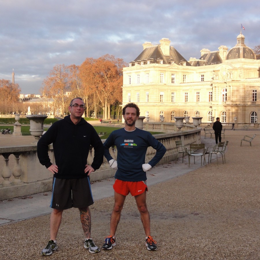Daniel, Wils – Le Sénat 9:06 AM – With Daniel and Wils of New York (USA), we ran largely on the left bank: the garden of plants, the arena of Lutecia, the Pantheon, street Saint Jacques… On our road, having gone down the Mountain Sainte Geneviève, we crossed the garden of the Luxembourg and met the Senate. The Senate with the National Assembly are the two chambers which represent the French legislative power.The French Senate is also called Palace of the Luxembourg, place where sit the senators since the revolution. This palace was ordered in 1615 by the regent Marie de Medici, the widow of king Henri IV and mother of Louis XIII. On our route, we noticed on the ground curious medallions: These medallions, among 135, were put in Paris in 1994, on the line of the meridian of Paris (today, we use the meridian of Greenwich). They indicate the North-south virtual line of the meridian with letters “N” and “S”.The Dutch artist Jan Dibbets so realized the tribute to François Arago (1786-1853), scientist and French politician.The meridian of Paris was established to allow the creation of the Astronomical Observatory of Paris created in 1667 (Arago was in particular the director of the Paris Observatory).Moreover, by running in the garden of the Luxembourg, near the Senate, Daniel pointed out to us the Observatory far off by looking at the South of the garden. How many “points Arago” will you find going through Paris? Follow the meridian! Merci Daniel, merci Wils ! The route of the tour: