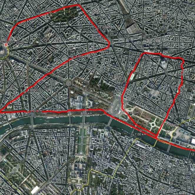 Parcours d’un guide Paris Running Tour (quelques enregistrements GPS Garmin Forerunner 405 effectués depuis mai 2008 – Entraînements, compétitions, Running tours, …) A Paris Running Tour, les coureurs-guides connaissent très bien leur ville, Paris. Sillonnant en long et en large la capitale presque chaque jour, ayant créé de nombreux beaux parcours, ils peuvent agréablement partager la ville avec les visiteurs-coureurs qui veulent la découvrir. Lors de sorties très matinales, certains endroits sont très privilégiés, les axes éclairés comme les quais de Seine ou le jardin du Champ de Mars, seul parc ouvert en permanence : Cliquez pour agrandir De nombreux coureurs dans le monde entier aiment partager un moment de course en montrant et commentant leur cité. Beaucoup de grandes villes possèdent des sociétés de « Running tours ». Nous voudrions saluer une petite nouvelle : Atlanta Running Tours Vous souvenez-vous de Kristy qui a couru avec nous ? Kristy est devenue guide Running Tour et fait découvrir la jolie ville d’Atlanta aux visiteurs sportifs. Nous lui souhaitons de très belles courses !