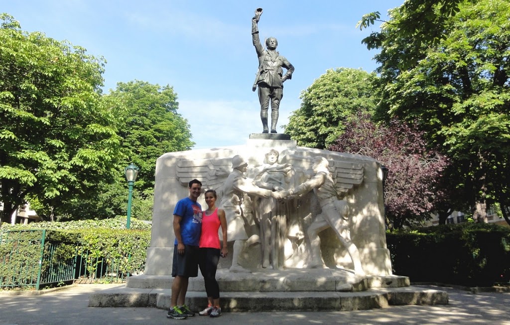 10h02 – Avec Heather et Chris, coureurs résidant en Virginie (USA), nous sommes partis de la place Charles de Gaulle-Etoile pour rejoindre la Palais Royal et son magnifique jardin. En chemin, nous avons croisé la place des Etats-Unis. Connaissez-vous l’histoire du nom de cette place ? A l’origine, cette place s’appelait la Place de Bitche (ville de Lorraine). L’ambassadeur des Etats-Unis vint s’y installer en 1881. Impossible de résider dans une place nommée Bitche, « Bitch » étant un mot d’argot anglais assez vulgaire. Paris accepta de renommer le lieu Place des Etats-Unis (la place de Bitche étant maintenant située dans le 19ème arrondissement de Paris). L’endroit porte bien son nom, de nombreux points de cette place sont en effet liés aux Etats-Unis d’Amérique, la statue de La Fayette et de Washington se serrant la main, le square Thomas Jefferson au centre de la place, la statue du dentiste américain Horace Wells qui participa à la découverte de l’anesthésie, le monument aux Volontaires américains (photo ci-dessus), etc. Le monument rend hommage aux volontaires américains engagés à la Légion étrangère et qui succombèrent en combattant au côté de la France pendant la première guerre mondiale. Parmi eux, le poète Alan Seeger. Nous poursuivons notre course et profitons de notre premier beau point de vue de la Tour Eiffel, avenue du Président Wilson : Heather et Chris – Avenue du Président Wilson Avenue du Président Wilson, de nouveau, une référence aux Etats-Unis. Cette avenue conduit elle-même à la place d’Iéna au milieu de laquelle se tient la statue équestre de George Washington ! Heather et Chris – Tour Eiffel Nouvel arrêt, face à la Tour Eiffel cette fois-ci. Remarquez la boule qui se trouve entre le premier et le deuxième étage. C’est une immense balle de tennis ! En effet, c’est la période du tournoi de Roland Garros. Après avoir profité des berges de la Seine et de ses nombreux sites splendides, nous marquons une pause au Louvre. Regardez la Cour Marly : Heather et Chris – Le Louvre – Cour Marly (le flash n’a pas marché !) Nous avions parlé des fameux chevaux de Marly lors d’une visite de Paris avec Mary. Nous retrouvons le soleil au sein du superbe jardin du Palais Royal (tout en roses !) : Merci Chris ! Merci Heather ! Le circuit du tour :