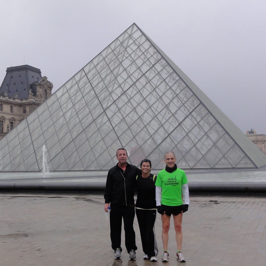 Pyramide du Louvre – Nigel, Karen et Jean-Charles 8:06 – Avec Karen et Nigel du Royaume-Uni, nous sommes partis du quartier de l’Opéra pour faire un circuit le long du fleuve. Karen et Nigel ont fini avec succès le semi-marathon de Brighton la semaine passée. Nous avons couru à un bon rythme cependant sans considération pour la pluie que nous avons eue à Paris ce matin. L’itinéraire que nous avons pris nous a permis de constater que beaucoup de lieux parisiens partagent le classicisme et la modernité avec harmonie. Par exemple, dans le quartier du Louvre, nous avons apprécié la pyramide du Louvre, qui a été créée de façon respecter à les anciens bâtiments environnants. Pas très loin, au Palais Royal, nous vîmes les Colonnes de Buren, un autre exemple d’art moderne intégrant un environnement classique (il y eut une forte contreverse au moment de sa création mais, à Paris Running Tour, nous aimons cette combinaison…) En traversant le passage du Louvre conduisant au Palais Royal, nous avons eu la chance d’apercevoir des salles du Louvre présentant un autre mélange d’art moderne et d’art classique : l’exposition temporaire de Tony Cragg, qui a juxtaposé ses sculptures modernes aux classiques. Merci Karen et Nigel !  « Red figure » – Tony Cragg – 2008 (sur la droite 😉 Le parcours :