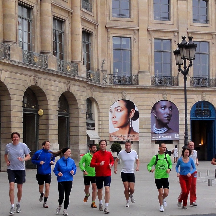 Courir Place Vendôme 9h43 – En ce mois d’avril, une importante société internationale s’est réunie quelques jours à Paris. A la fin du séjour de travail, une journée de détente était consacrée à la visite de la capitale. Un parcours sportif de Paris était organisé : rien de tel que la course à pied pour se détendre pleinement. Nous sommes partis, Vincent, Frédéric et Jean-Charles, accompagner le groupe de coureurs pour un tour longeant les rives droite et gauche de la Seine, passant par la place Vendôme, les Tuileries, les Champs Elysées, la tour Eiffel, le Louvre et l’Opéra Garnier. Merci à eux ! Devant la tour Eiffel La tour Eiffel : Le saviez-vous ? Dès le début de la mise en service de la tour Eiffel, cinq ascenseurs hydrauliques transportaient les visiteurs. A l’époque, pour une telle hauteur et de tels poids, ce fut une vraie prouesse technique. Pendant longtemps, les ascenseurs étaient conduits par un pilote qui se trouvait à l’extérieur de la cabine. Il endurait le froid ou la chaleur selon les saisons… Une reproduction grandeur nature de ce pilote se trouve sur l’un des ascenseurs. Essayez de le voir au travers de la vitre de l’ascenseur : Pilote d’ascenseur ! Le circuit du tour :